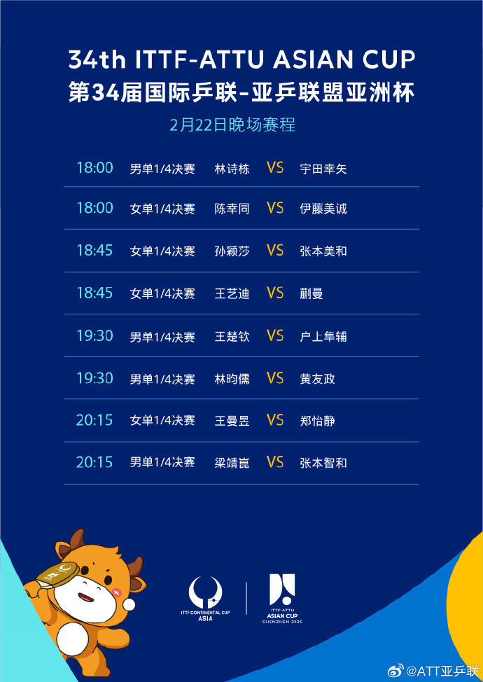 2月22日晚,2025年乒乓球亚洲杯在深圳继续进行。根据赛程,今天18点起将同步进行男单1/4决赛和女单1/4决赛,具体有哪些安排呢?